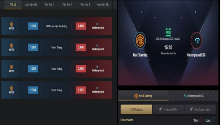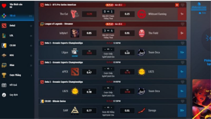 - Step 4: On the toolbar, select “Esports” to immediately switch to the game interface. You choose the tournament to participate in like LOL, on the right there are statistics of matches and bets taking place.